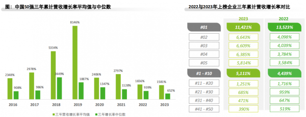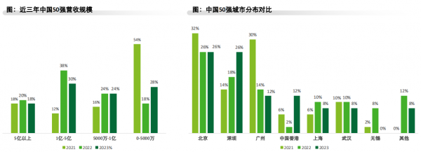 报告显示,在营收增长上,2023年中国50强的营收增长持续放缓,而Top10企业增势不减;从营收规模看,相比2022年有所下降,收入超1亿元的企业占比48%,而去年为58%。