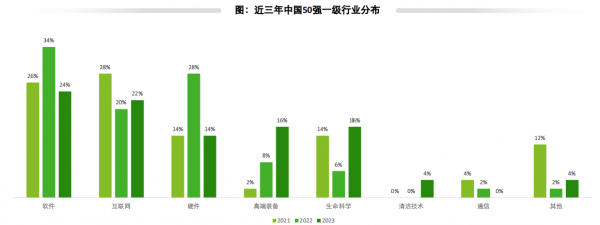 在行业分布上,生命科学、软件、互联网、硬件位居前四。一级行业中,软件占比依然最高,生命科学的增长最快,其次是高端装备,与去年相比,生命科学行业上榜企业数上升11%,软件企业下降2%,互联网企业与去年持平。二级行业中,中国50强企业呈现多元化格局,车联网、智能制造位居前两位。