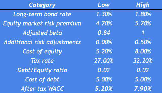 贝塔系数接近0.8-1,权益成本在5%-8%之间,债务成本接近5%,那么其加权平均资本成本可能在5%-7.9%之间。在这种情况下我们使用7.4%的加权平均资本成本。