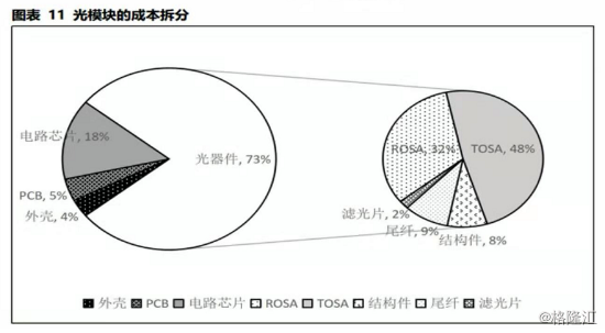从成本端来看,主要的大头在于光器件(73%)以及电路芯片(18%)等。