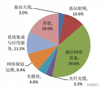 未来的5G投资中,国内三大运营商预计会有1.3万亿的规模,比4G多出8000亿元,同比高出60%。细分领域中,网络设备占据40%的份额,基站天线射频、光纤光缆和光模块的投资占比分别为14%、3.3%、4.6%。