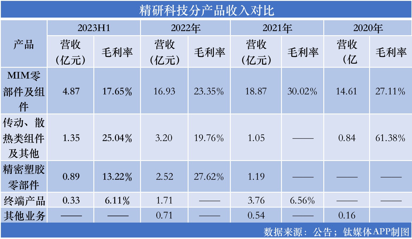 四年多后,精研科技的业务确实多元,然而从业绩贡献度来看,不尽人意。根据精研科技给钛媒体APP的回复,2021年公司传动、散热业务尚处于起步阶段,收入有限、毛利率为负;次年收入增加、毛利率转正。到了2023H1,传动、散热类组件及其他收入合计1.35亿元,依然难挑“大梁”。