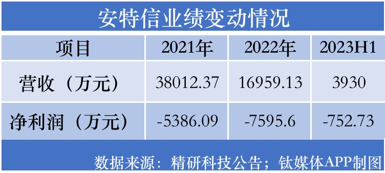 具体而言,2022年以来的亏损又是多项减值计提堆叠出来的。2022年,公司计提存货跌价准备2.06亿元,固定资产减值损失1.73亿元,安特信无形资产减值准备733.87万元,安特信商誉减值准备2196.92万元。甚至因为计提存货跌价准备和固定资产减值损失金额过大,精研科技遭深交所问询“是否存在过度计提”。2023年上半年,公司再计提存货跌价准备3375.31万元。