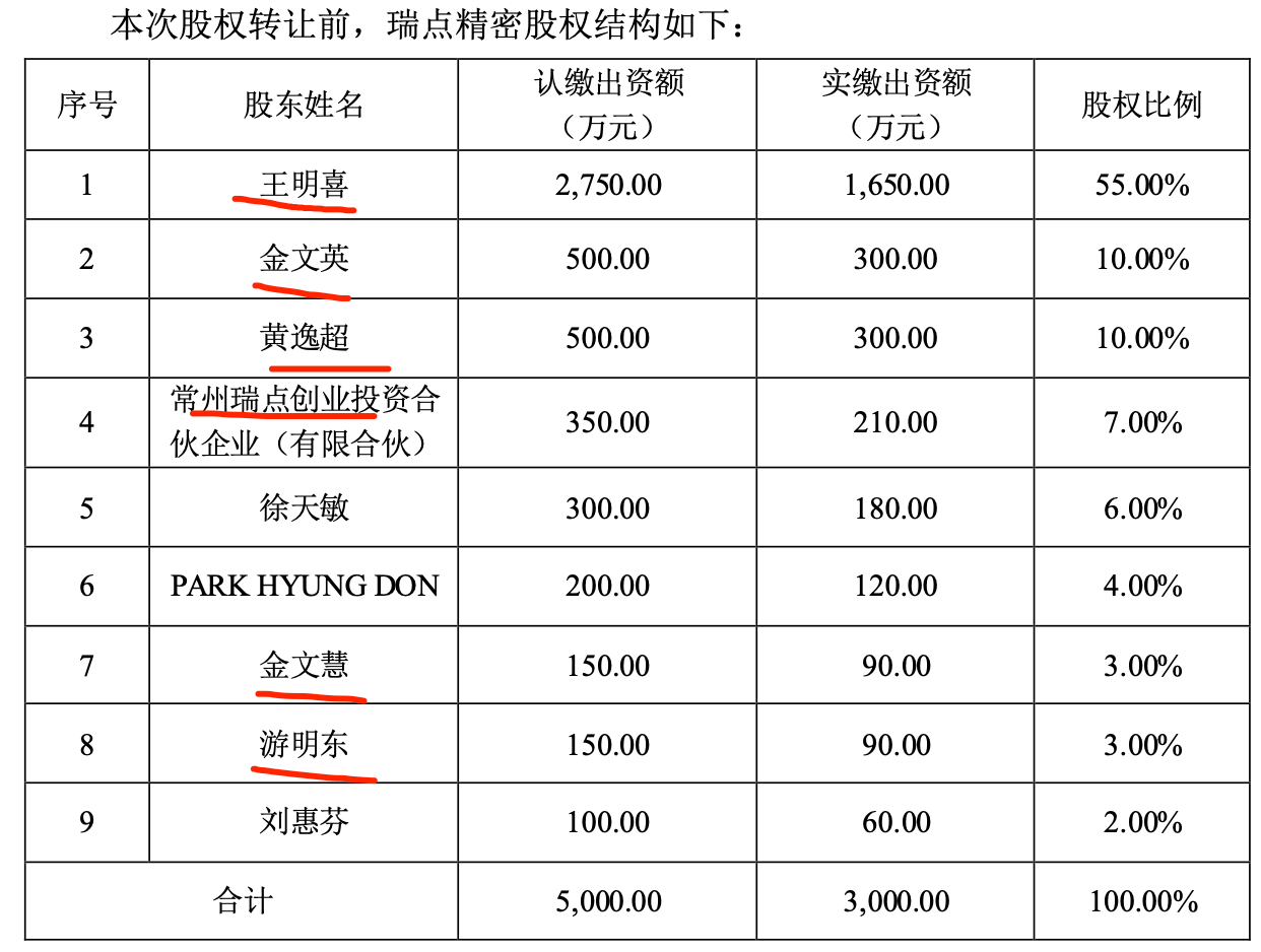 资料显示,瑞点精密是精研科技实控人之一、董事长兼总经理王明喜家族控制的企业,其中金文英是王明喜的配偶,黄逸超是二人的女儿,常州瑞点创业投资合伙企业(有限合伙)是金文英控制的企业,金文慧是金文英的姐妹,游明东则为精研科技的副总经理。