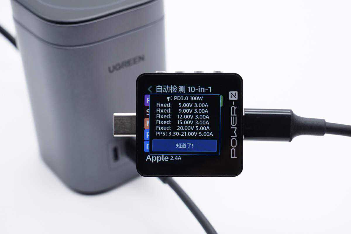 多口同时输出测试绿联100W二合一氮化镓充电站配备了2C1A三个接口,在极端多口输出环境下的分配情况,还需要实际测试一下。