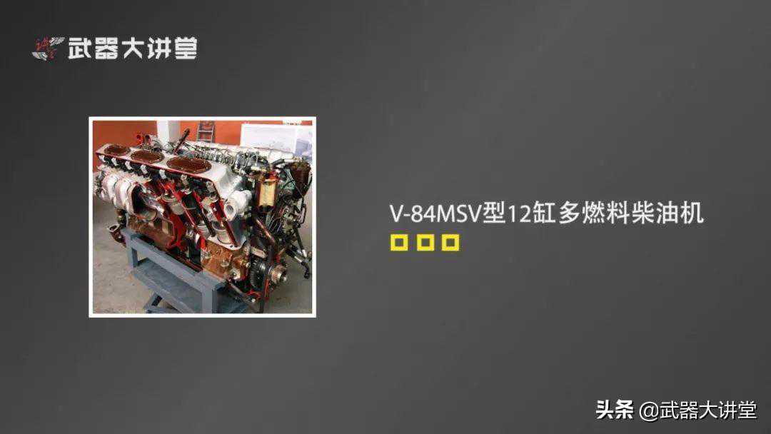 动力系统方面,初始版本动力为V-84MSV型12缸四冲程水冷燃油直喷离心式机械增压多燃料柴油机。这款引擎能使用柴油、汽油和煤油驱动,当然酒精到底能不能驱动没有人试验过,理论上来说应该是没有问题,V-84MSV发动机最大功率617.4千瓦,能提供60km/h的最大公路速度。