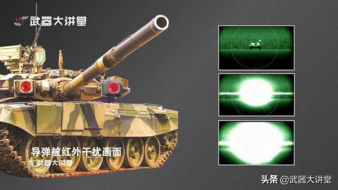 毕竟现在大多数反坦克导弹都使用激光红外复合制导,所以这个系统是主要的防御系统,在开机的状态下会产生红色的亮光,非常像一对红色的双眼,而毕竟要发射大量的强红外辐射脉冲,因此这个发射器的功率很大,达到了1000W,所以会产生大量的热量,会产生热气流影响到上方车长和炮长的瞄准,所以一般情况下都会加装一块金属盖板以减少热气对观察/瞄准镜的干扰,在后期改进型之后换成了方形散热针的模式进行散热。