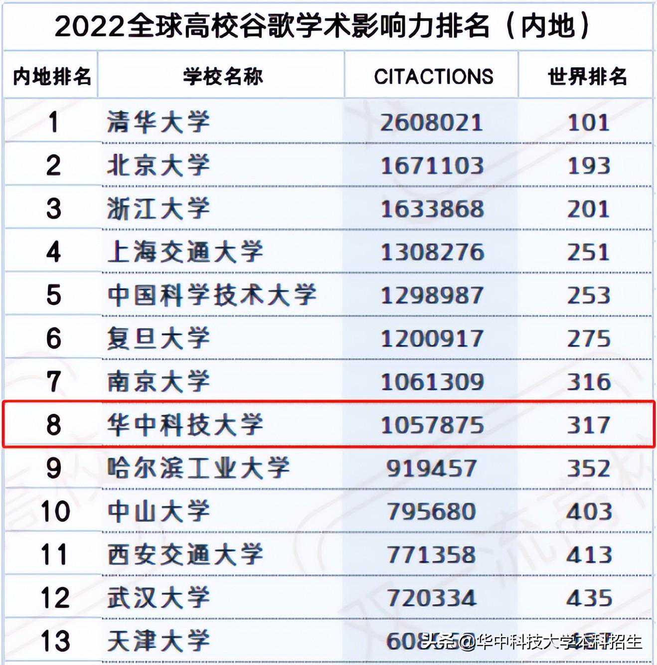 在2022全球大学谷歌学术影响力排名中,位居中国内地高校第8,世界排名第317;