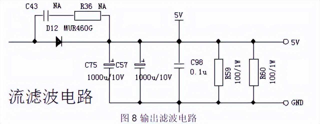 图8中C57、C75为反激电源输出滤波电容,这些电容都是电解电容,电解电容ESR比较大,所以主要考虑电容ESR对输出电压纹波的影响。另外电解容量一般比较容易做大,所以一般不需要考虑容量对纹波的影响。