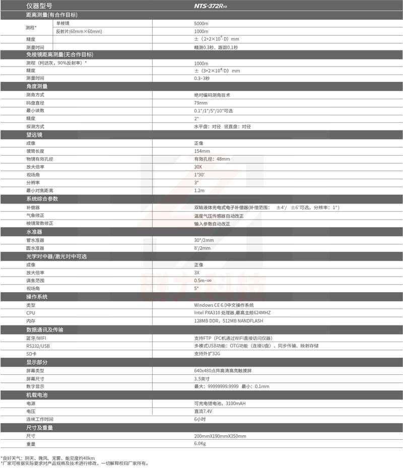 NTS-372R10超长测程WIN全站仪是经历全方位升级而诞生的综合型全站仪,架构于全新型一体化机身,测距光机电及测角主控系统全面提升,使得测距更快更长更稳定。采用操作系统,将测角、测距功能用更人性化的界面、更稳定的系统支持实现,使得人机交互更具有体验感。是一款高档次、高性能、低价位的全能型产品。