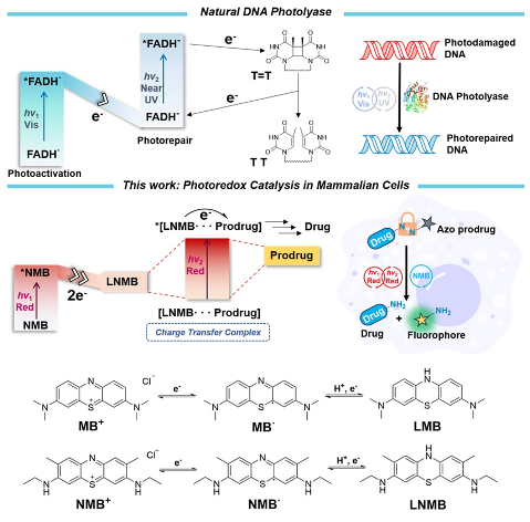 12月11日,化学系胡可青年研究员及合作成员受自然界中天然光酶(DNA光裂合酶)修复受损伤DNA机制的启发,提出光催化剂逐次累积红光光子能量以达到高能激发态的策略,实现红光催化裂解偶氮键,并成功应用于乏氧细胞内的红光生物正交偶氮前药激活。该研究成果以“Nature-InspiredPhotocatalyticAzoBondCleavagewithRedLight”为题在线发表于。