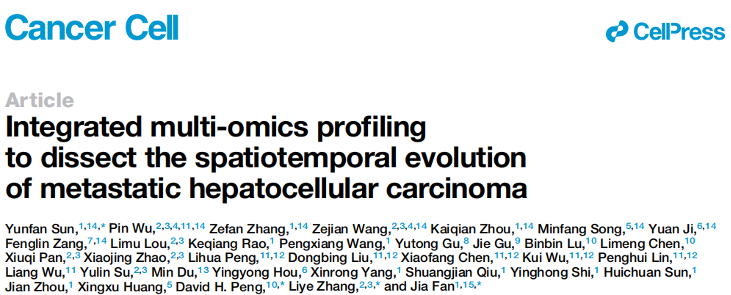 12月14日,附属中山医院肝癌研究所樊嘉院士课题组与上海科技大学张力烨团队及上海顿慧医疗合作,于肿瘤学期刊CancerCell在线发表了题为“Integratedmulti-omicsprofilingtodissectthespatiotemporalevolutionofmetastatichepatocellularcarcinoma”的研究成果。该研究整合分析多组学数据,在国际上首次系统刻画了肝癌转移的时空演进全景图谱,揭示了肝癌转移的复杂进化轨迹和克隆选择机制,为研发肝癌转移预测的新标志物和治疗新靶点提供了宝贵的数据和理论基础。