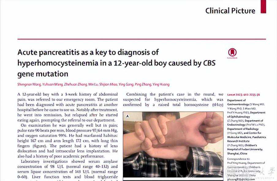 12月9日,TheLancet第402卷的clinicalpicture模块刊登了附属儿科医院消化科黄瑛教授团队的临床病例文章“Acutepancreatitisasakeytodiagnosisofhyperhomocysteinemiaina12-year-oldboycausedbyCBSgenemutation。”该高同型半胱氨酸血症病例为全球罕见疾病,以急性胰腺炎作为主要表现而被发现、诊治的病例更屈指可数,该病例的发表具有相当重要的临床意义。