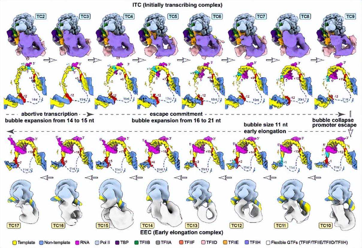 12月22日,生物医学研究院徐彦辉课题组在Science杂志上在线发表题为“Structuralvisualizationoftranscriptioninitiationinaction”的研究长文(ResearchArticle)。该项研究首次用结构重现出了转录从头起始的16个连续动态全过程,揭示了通用转录因子(GTFs)和转录泡协同RNA聚合酶PolII调控转录起始向转录延伸转变的分子机制。