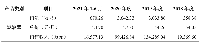第三是灿勤科技产品单价不断下降。2018年公司滤波器单价为54.05元/只,到2021年上半年,公司滤波器单价已经降至24.7元/只。