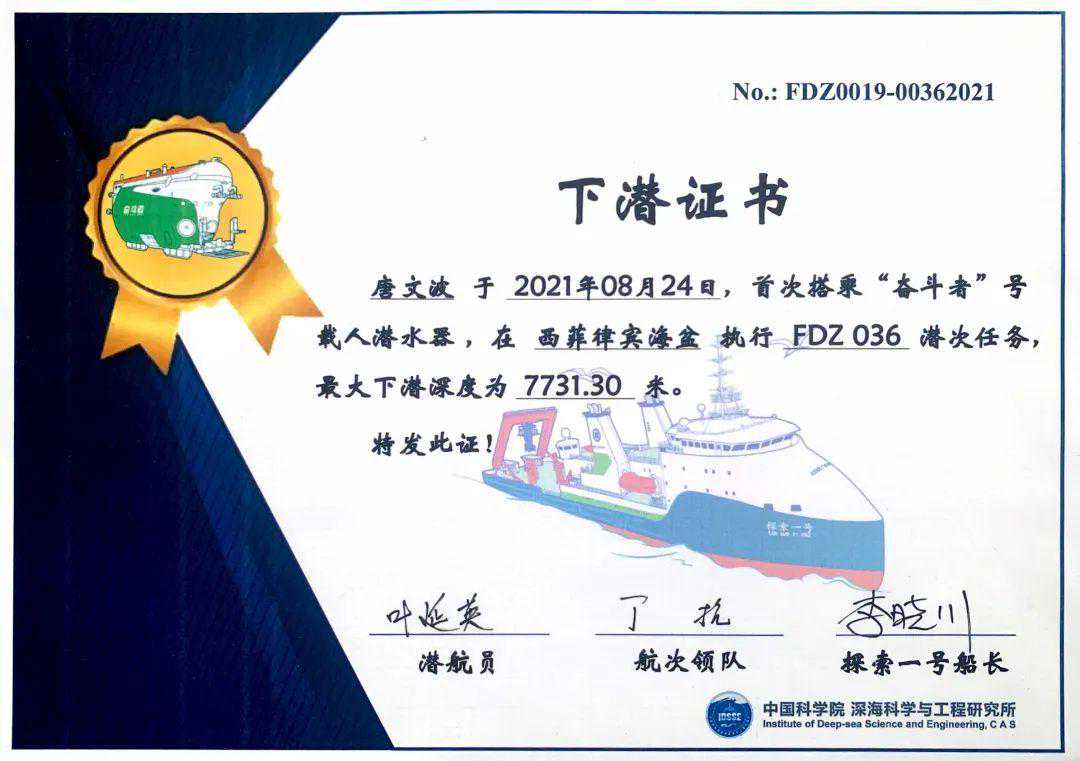 湖南科技大学在校研究生唐文波,全程参与了本航次科考任务,并作为第19位下潜科考队员搭乘“奋斗者”号载人潜水器,于8月24日在西菲律宾海盆执行FDZ036潜次任务中,下潜至7731.30米深渊海底,并完成全海深沉积物气密取样器取样作业。