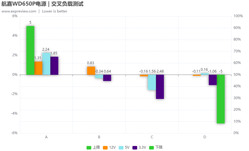交叉负载的测试与前面的均匀负载测试的评判标准一致,电压偏离额定值越少越好,各路偏离率允许的值都为±5%。