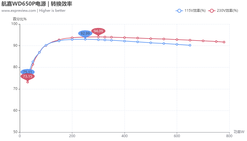 转换效率航嘉WD650P是一款通过了80Plus铂金认证的电源,在230V输出的环境下,输出50W功率时其转换效率已经超过82%,输出100W时转换效率超过90%,半载时转换效率达到94%以上,满载效率超过92%左右,整体平均效率超过92%;在115V输入下最高转换效率接近93%,满载效率在90%左右,这个表现确实符合80Plus铂金认证的要求。