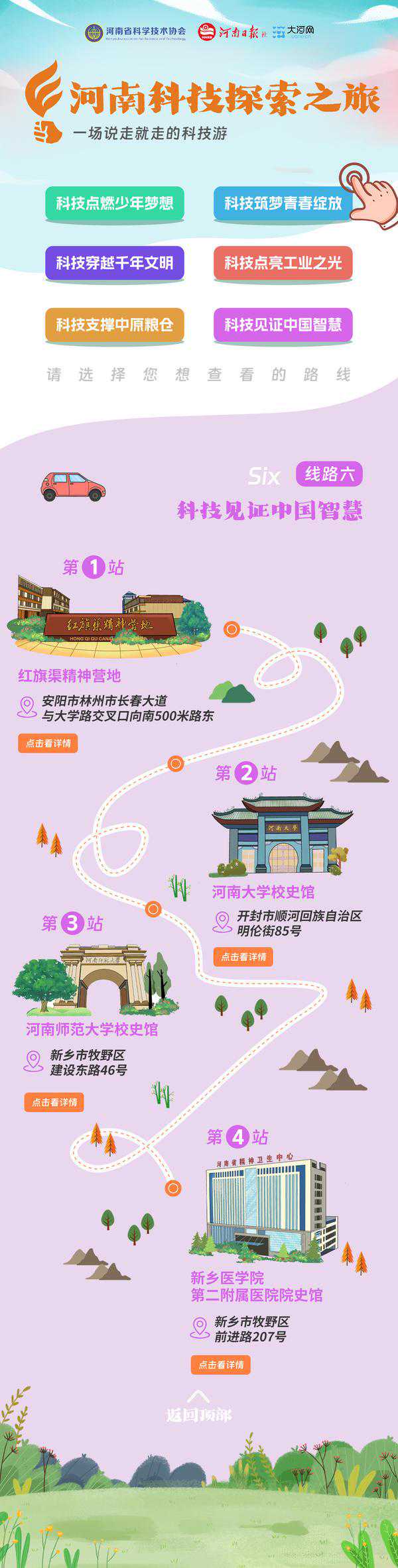 推荐线路:红旗渠精神营地、河南大学校史馆、河南师范大学校史馆、新乡医学院第二附属医院院史馆
