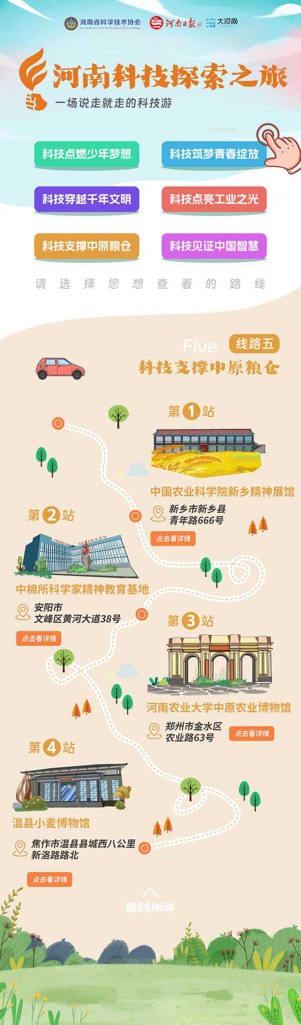 推荐线路:中国农科院新乡精神展馆、中棉所科学家精神教育基地、河南农业大学中原农业博物馆、温县小麦博物馆