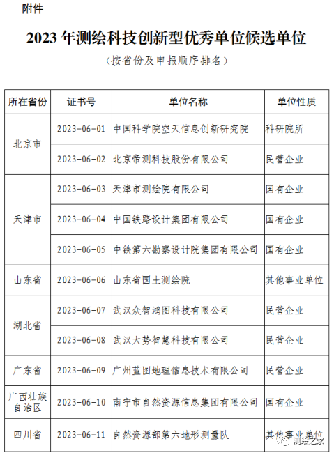 经专家形式审查和终评等规定程序,共评选出“2023年测绘科技创新优秀单位”候选单位11家。评选结果已经中国测绘学会科学技术奖励委员会审议批准。