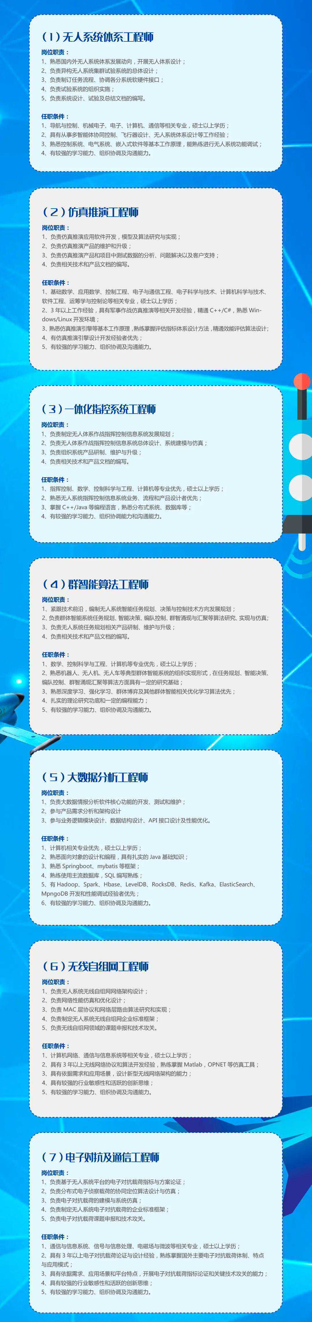 1.负责任务需求、指挥控制、任务规划、人工智能等一个或多个领域的技术研究和发展规划研究。