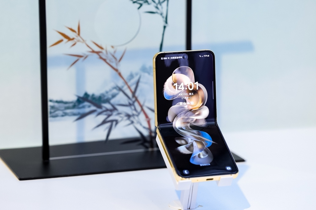 以精致机身承载优雅风范,心系天下三星W24Flip轻盈开合之间,尽显独特的优雅动感。冰瓷白陶瓷背板兼具经久不衰的美学视效与工艺品级的温润触感,折叠状态下仿佛一枚珍贵宝盒,自然流露高贵雅致。采用奢华金配色的边框与铰链盖勾勒出机身轮廓,铰链处精心设计的宝石状方格赋予机身未来派外观,伴随持有者的举手投足呈现珠宝般流光婉转,闪耀夺目光华。展开机身,富有电影感的“心系天下”Logo动效,尽显简约大气的高级感。潇洒飘逸的“浮生若梦”动态壁纸,将金玉材质与丝绸肌理调和出独特美感,以温婉线条与曲面形态寓意生命的多维百态,豪情纵横之余,更添几分不羁与洒脱。
