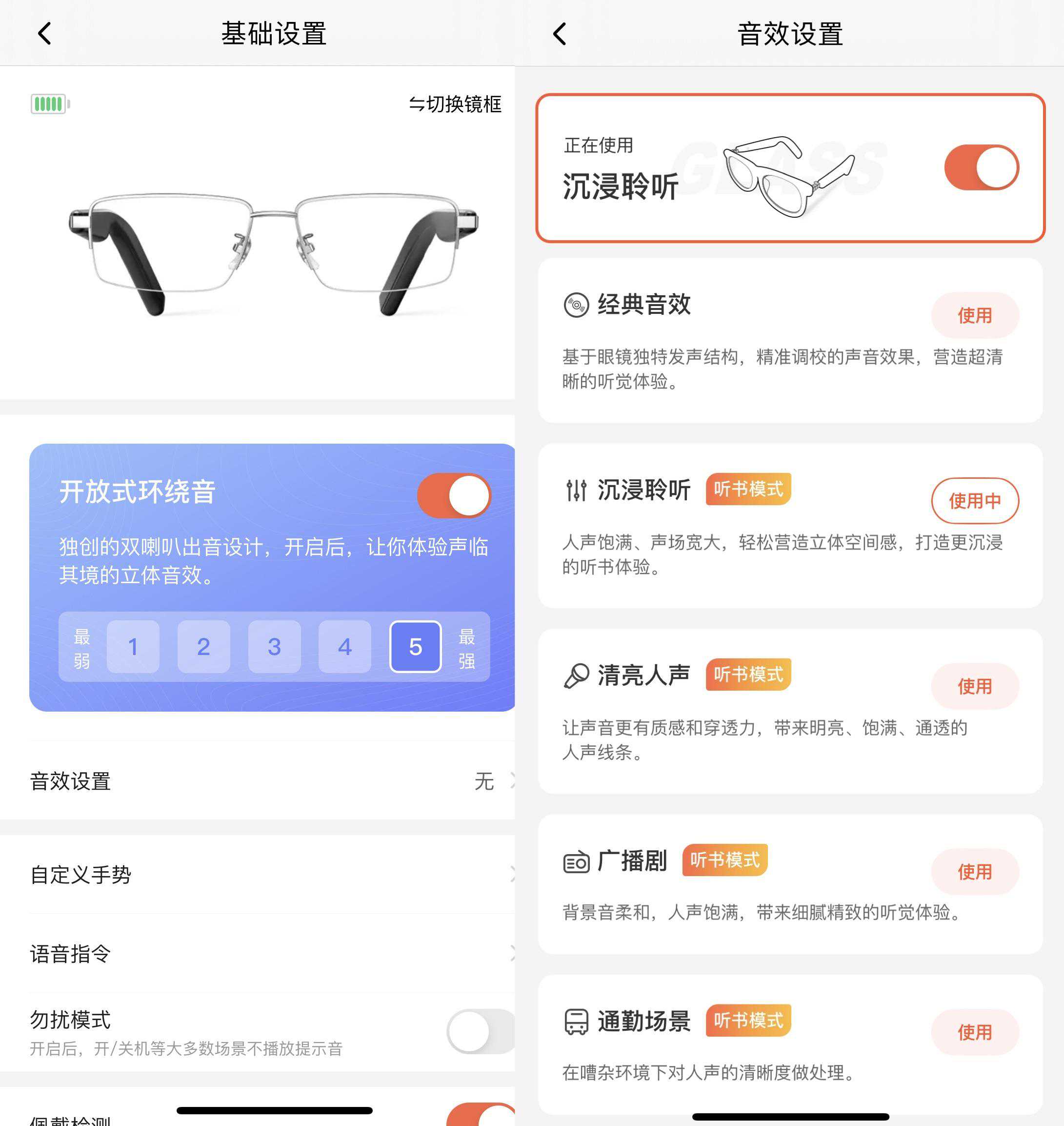 ▲在喜马拉雅APP里面,把智能眼镜绑定好之后,就能开启它的丰富个性设置了,在里面我们可以打开环绕立体声音效,打开这个功能后音乐播放时就会更近身临其境,虽然没有达到入耳式耳机那么震撼,但也是相当不错的了!