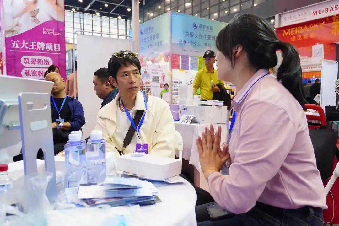 图为:参展者在卡茵诗展位向工作人员了解产品