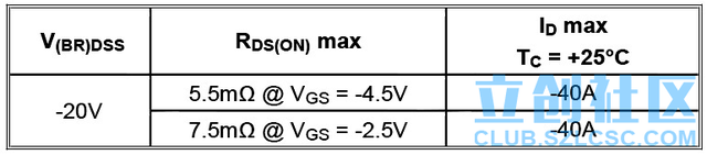 如表中所示,当栅源电压为–4.5V时,导通电阻最大为5.5mΩ,数据手册给出的导通电阻典型值为4.2mΩ@–4.5V。本电子制作能达到的最大栅源电压为–5.0V,因此,导通电阻达到5mΩ附近是完全可能的。后面的实测结果证实了这一点。